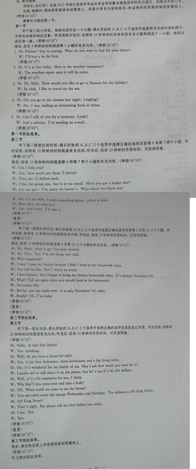 一、听力(本题有15小题,第一节每小题1分,第二、三节每小题2分;共25分)