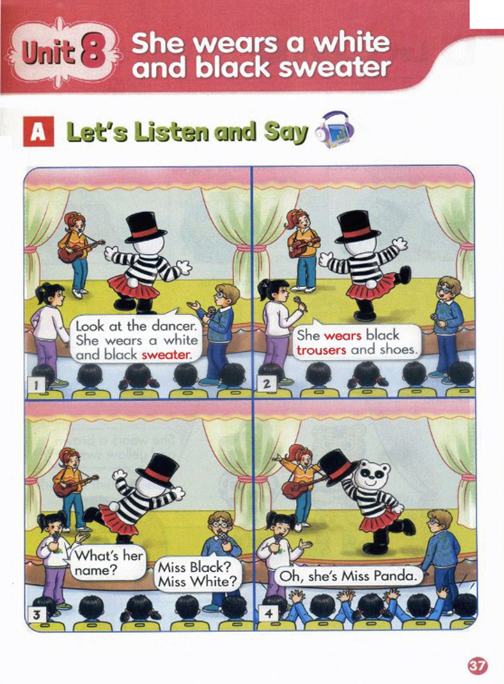 > Unit 8 She wears a white and black sweater