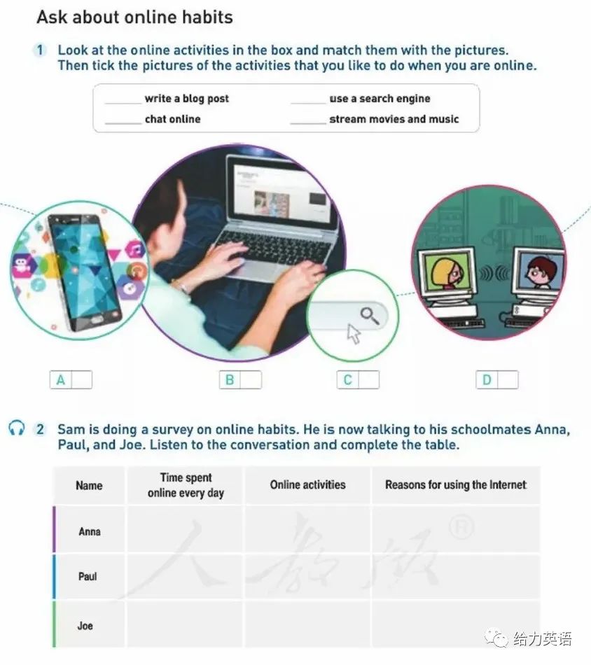这是新课程最新版高中英语教材,是由人民教育出版社出版、教育部2019审核通过的高中英语教材。其中必修教材分为第一册、第二册和第三册共3册,选择性必修教材分第一册、第二册、第三册和第四册共4册,选修教材分为第一册、第二册和第三册共3册。 ---Listen and speak听力原文--- Sam: Hi, guys! I'd like to ask you some questions about your online habits. First, how much time do you spend online every day? Anna? Anna: It depends. I'd say two or three hours Sam: How about you. Paul? Paul: Oh, maybe about two hours. Sometimes more. What about you, Joe? Joe: Well, I think I spend at least an hour every day. Sam: What do you usually do online, Joe? Joe: I have a blog. It's like an online diary where you write about something you’ re interested in. For example, I like basketball, so I write a lot on my blog about my favourite team. It's fun. Anna: I like to stream videos and music. That is. I watch videos and listen to music online. It's cheap and easy. Sometimes I look up information, too. With the Internet, I can also chat with my friends anytime, anywhere. Paul: I usually use a search engine to do my homework. A search engine is a tool that helps you find what you're looking for. With it, I can find all the information, videos, and pictures that I need for my homework. It's so helpful. Sam: Great. It seems like you all use the Internet every day. So what do you think life would be like without the Internet? Joe: No Internet?! Are you kidding? Life would be over!. Pronunciation |
