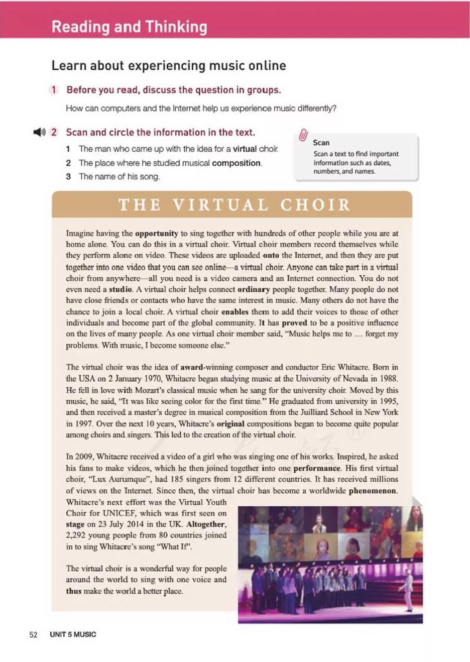 这是新课程最新版高中英语教材,是由人民教育出版社出版、教育部2019审核通过的高中英语教材。其中必修教材分为第一册、第二册和第三册共3册,选择性必修教材分第一册、第二册、第三册和第四册共4册,选修教材分为第一册、第二册和第三册共3册。 ***Reading and Thinking (page 28) 课文文本和翻译*** THE VIRTUAL CHOIR 虚拟合唱团 Imagine having the opportunity to sing together with hundreds of other people while you are at home alone. You can do this in a virtual choir. Virtual choir members record themselves while they perform alone on video. These videos are uploaded onto the Internet, and then they are put together into one video that you can see online—a virtual choir. Anyone can take part in a virtual choir from anywhere—all you need is a video camera and an Internet connection. You do not even need a studio. A virtual choir helps connect ordinary people together. Many people do not have close friends or contacts who have the same interest in music. Many others do not have the chance to join a local choir. A virtual choir enables them to add their voices to those of other individuals and become part of the global community. It has proved to be a positive influence on the lives of many people. As one virtual choir member said, “Music helps me to ... forget my problems. With music, I become someone else.” 想象一下你独自在家就有机会与数百人一起歌唱。你可以在虚拟合唱团中做到这一点。虚拟合唱团成员在单独录制视频的同时进行录制他们自己。这些视频被上传到网上,然后被整合成一个你可以在线观看的视频——一个虚拟合唱团。任何人从任何地方都可以参加虚拟合唱团——你所需要的只是一台摄像机和互联网连接。你甚至不需要录音棚。虚拟合唱团有助于将普通人联系在一起。许多人没有对音乐有相同兴趣的亲密朋友或联系人。许多其他人没有机会参加当地的合唱团。虚拟合唱团使他们能够将自己的声音加入到其他人的声音中,并成为全球社区的一部分。事实证明,这对许多人的生活产生了积极影响。正如一位虚拟合唱团成员所说:“音乐可以帮助我……忘记我的烦恼。在音乐的帮助下,我变成了另一个人。” The virtual choir was the idea of award-winning composer and conductor Eric Whitacre. Born in the USA on 2 January 1970, Whitacre began studying music at the University of Nevada in 1988. He fell in love with Mozart’s classical music when he sang for the university choir. Moved by this music, he said, “It was like seeing color for the first time.” He graduated from university in 1995, and then received a master’s degree in musical composition from the Juilliard School in New York in 1997. Over the next 10 years, Whitacre’s original compositions began to become quite popular among choirs and singers. This led to the creation of the virtual choir. 虚拟合唱团是屡获殊荣的作曲家兼指挥家埃里克o惠塔克的创意。惠塔克于1970年1月2日出生在美国,1988年开始在内华达大学学习音乐。当他为大学合唱团唱歌时,他爱上了莫扎特的古典音乐。他被这段音乐打动了,他说:“那种(兴奋的)感觉就如同第一次看见色彩一样。”他于1995年大学毕业,随后于1997年获得纽约茱莉亚音乐学院音乐创作硕士学位。在接下来的十多年里,惠塔克的原创作品在合唱团和歌手中开始流行。这促使了虚拟合唱团的创建。 In 2009, Whitacre received a video of a girl who was singing one of his works. Inspired, he asked his fans to make videos, which he then joined together into one performance. His first virtual choir, “Lux Aurumque”, had 185 singers from 12 different countries. It has received millions of views on the Internet. Since then, the virtual choir has become a worldwide phenomenon. Whitacre’s next effort was the Virtual Youth Choir for UNICEF, which was first seen on stage on 23 July 2014 in the UK. Altogether, 2,292 young people from 80 countries joined in to sing Whitacre’s song “What If”. 2009年,惠塔克收到了一个女孩在演唱他的作品的视频。受到启发,他让歌迷们制作视频,然后将视频合并到一个表演中。他的第一支虚拟合唱团《金色光芒》有来自12个不同国家的185位歌手。它在上收到数以万计的浏览量。从那时起,虚拟合唱团已成为一种全球现象。惠塔克的第二个壮举是打造联合国儿童基金会“虚拟青年合唱团”,该合唱团于2014年7月23日在英国首次亮相。总共有来自80个国家的2292名青年参与演唱惠塔克的歌曲《假如》。 The virtual choir is a wonderful way for people around the world to sing with one voice and thus make the world a better place. 虚拟合唱团是让全国各地的人用同一个声音唱歌,从而使整个世界变得更美好的绝妙方式。 |
