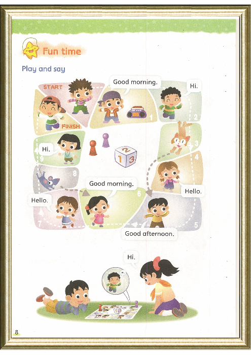 是句型操练板块,用来复习story time的知识点。这是一个有趣的,学生熟知的棋盘游戏。可以两人或多人一起玩。根据色子掷出的点数,向前移动,停留在哪里,就要对其中的问候语作出回答。回答正确继续掷色子前行,反之则返回到前一个原点。先到达终点者为胜利者。通过该语言实践活动,帮助学生熟练掌握Story time中呈现的交际用语:Hi, Hello, Good morning, Good afternoon,通过游戏的形式,提高他们用英语进行简单交流的能力。