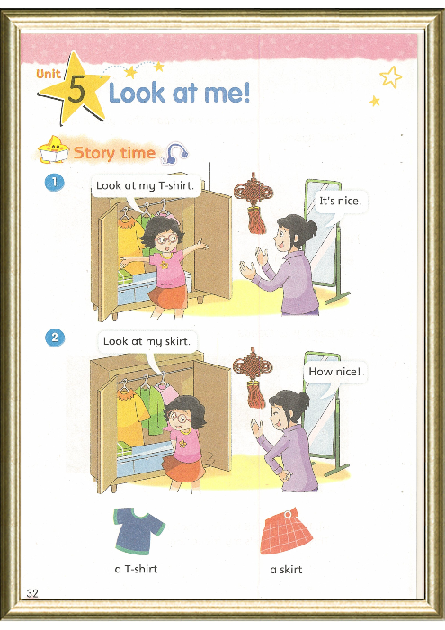 2.句型方面,学生已经掌握句型 This is … 的表达方式。我们可以由This is a … 或者This is my …引入,学习新句型 Look at my …从而引导学生在谈论自己的衣物的时候作出适当的评价。