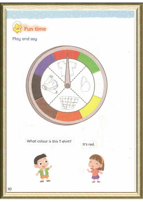 通过趣味性活动,让学生操练主要词汇、句型和日常交际用语。在这版块,我们可以课外提前制作好转盘,并在转盘上添加所补充的服饰图片,让学生最大限度地输出。这个游戏可以变成竞赛,A组转,B组读单词,然后,B组转,A组再读单词,看哪一组读的多。这个游戏也可以变成do and say,要求学生转到哪一问,就用这个词造句。当然,也可以分组赛。除此之外,我们也可以把已学字母添加在转盘上。让学生试着说“A is green.C is blue”等等。我们还可以给学生更大的自由空间。让他们尽可能地自己编对话。