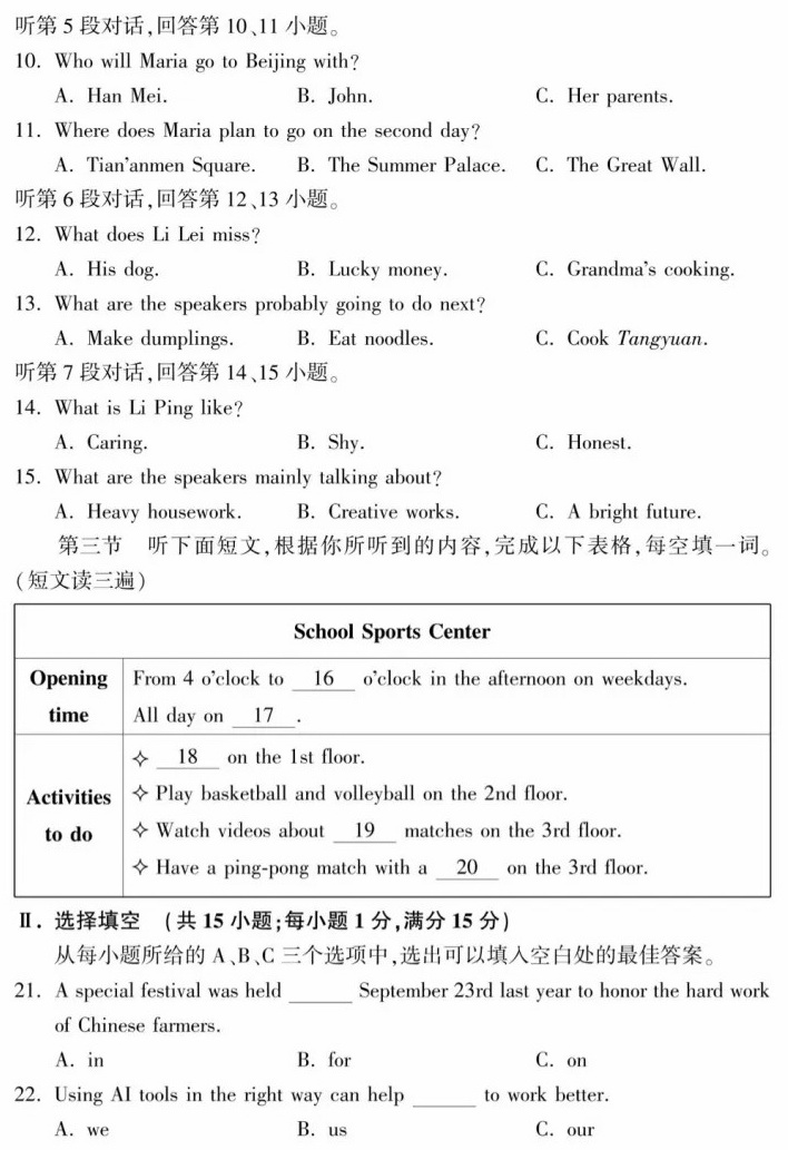 福建省2024年初中学业水平考试英语试题和答案