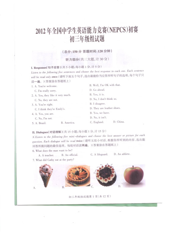 012年全国中学生英语能力竞赛(NEPCFSS)初三年级组初赛答案