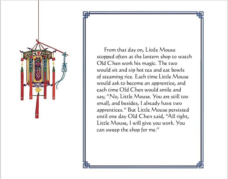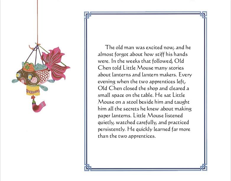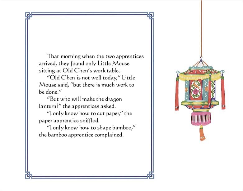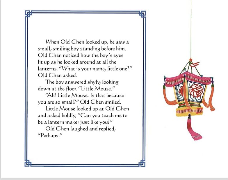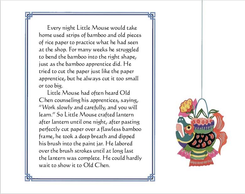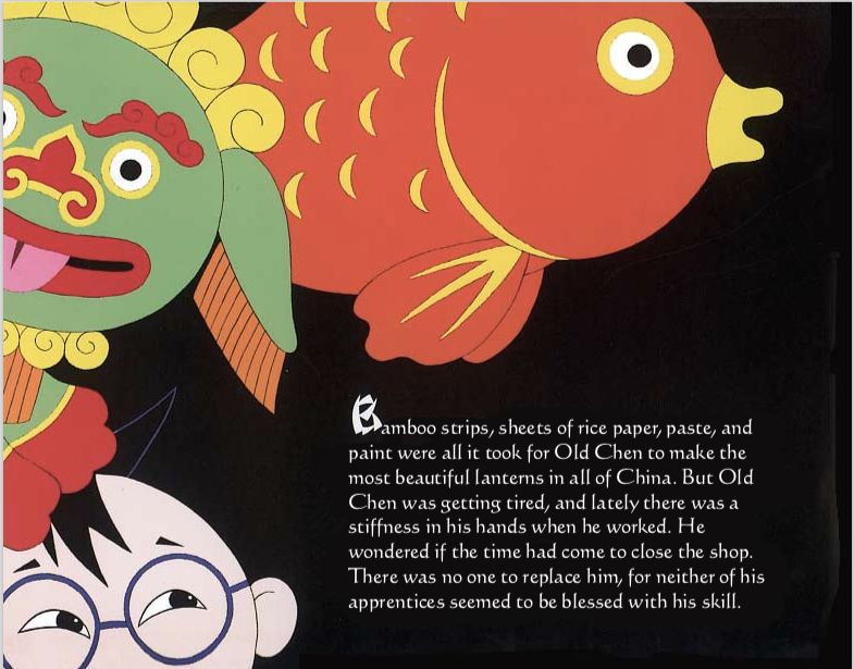 “纸灯笼”是一本非常漂亮的书,作者和插画家Stefan Czernecki用精美的书面和插图故事创作了一件真正的艺术作品。插图采用中国传统剪纸的风格,许多配合文字出现的剪纸中国灯笼都非常棒。