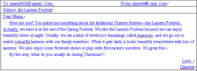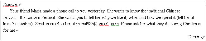 十九、假设你是小伟。你的室友大明昨天接到你朋友Maria的电话。她正在研究中国的节日文化,需要你的帮助。现在,请你根据大明所留的便条内容,给Maria回一封电子邮件。
