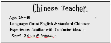 七、假如你是李明,在网上看到一则美国某大学孔子学院招聘汉语老师的广告,请你根据信息内容,用英语给Mr.Smith写一封email,向他推荐一位符合条件的老师。