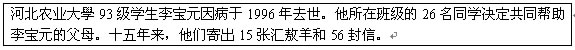 I'd like to tell you a true story. Li Baoyuan. a student of Hebei Agricultural University came from a poor family. Unluckily,