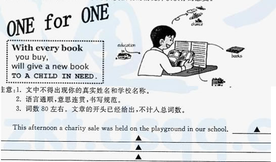 十六、假如你是李平,准备参加学校组织的英语征文比赛。请根据下面所提供的信息,介绍今天在你校操场举行的“ONE for ONE”图书义卖活动的情况并谈谈你的感受。